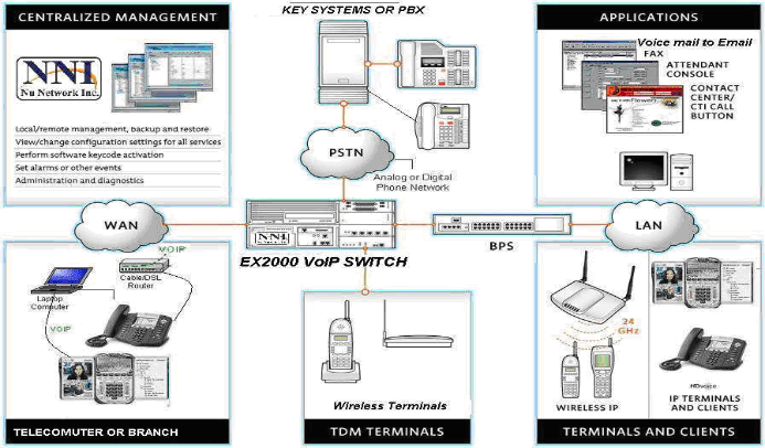 Open Source EX20000 Unified VOIP, originally authored by Mark Spencer of Digium, which including SIP, IAX, T1, E1, ISDN, PRI, FXO, and FXS. All of these protocols are also supported by our EX2000 PBX Unified VOIP. Asterisk is what Nu Network Inc. considers the "OS of the PBX" and is responsible for much of the core call routing/switching that occurs within the Ex 2000 VoIP PBXs.